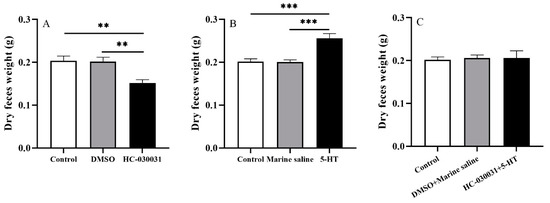 The dry weight of the 48-h accumulated feces was significantly higher in the 5-HT group than those in the control and marine saline groups (df1 = 2, df2 = 12, F = 14.773, both p < 0.001, Figure 6B). The dry feces weight showed no significance between the control and marine saline groups (p > 0.05).