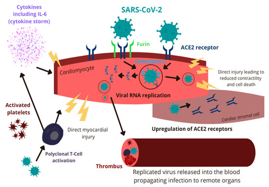The exact pathophysiology of COVID-19-associated myocarditis has not been completely elucidated yet, but multiple potential mechanisms have been proposed. SARS-CoV-2 may affect the myocardium via direct injury or indirectly as a result of innate immune system overactivation [30,31,32]. Initially, the virus enters the cytoplasm of host cells, a process facilitated by binding of the spike (S) glycoprotein, abundant on the surface of SARS-CoV-2, to the angiotensin-converting enzyme 2 (ACE2) transmembrane proteins [33,34,35]. ACE2 is expressed extensively on the cilia of respiratory epithelium, making it a prime target for viral invasion over an extensive surface area [36]. The process is facilitated by transmembrane serine protease 2 (TMPRSS2) and neuropilin 1 (NRP1) [37]. After gaining access to the host cell’s cytoplasm, the viral RNA replicates, translates into proteins, and virion particles are assembled. Subsequently, these are released into the blood and use the circulatory system to propagate the infection to remote organs [38]. ACE2 is known to be expressed on the surface of cardiac myocytes and endothelial cells, making the heart a prime target for the virus [39]. Interestingly, the binding of SARS-CoV-2 with ACE2 receptor causes internalization and loss of ACE2, resulting in unopposed angiotensin II activity leading to cardiac hypertrophy, fibrosis, reactive oxygen species production, and ultimately myocardial cell apoptosis [40,41,42]. In addition, studies found that cardiomyocytes express SARS-CoV-2 and coronavirus-associated receptors and factors (SCARFs), cathepsin-L, and furin that may facilitate direct cellular invasion by SARS-CoV-2 [43,44]. Pluripotent stem cell-derived cardiomyocytes infected with SARS-CoV-2 have been shown to have increased interferon signaling, apoptosis, and reactive oxygen stress which result in reduced cardiac contractility and cell death [45]. In vitro studies have demonstrated that SARS-CoV-2 can also infect the stromal cells and cause further cardiotoxicity owing to the differentiation of stromal cells into myofibroblasts. This will promote ACE2-dependent intracellular viral replication and, ultimately, the infection of adjacent cardiac cells [44]. It is further hypothesized that the formation of multinucleated syncytia may result in the fusion of contractile and non-contractile myocardial cells, ultimately causing further, extensive cardiac injury [46]. Finally, a viral infection of the endothelial cells and pericytes leads to increased platelet activation and microthrombi formation within the coronary circulation. These provoke ischemic myocardial injury, fibrosis, and ultimately, cardiac dysfunction [47].