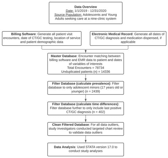 - A master database was then created to compile all variables together and match each patient visit with each variable of interest. The master database included all patient visits from 1 January 2019 to 31 December 2020, and included the patient demographics. The CT/GC testing, diagnosis, and treatment lists were used to match the master database with the respective patient and date of visit. The specific diagnosis date was matched to the correct testing date, and the treatment was matched to the correct diagnosis date. The master database was then filtered to only include adolescent minors.