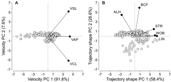 Biplots detailing the relationships between principal components of sperm velocity (A) and trajectory shape (B) and their constituent variables. Variable values were log10 or arcsine transformed prior to analysis. VCL: curvilinear velocity. VSL: straight-line velocity. VAP: average path velocity. LIN: linearity. STR: straightness. WOB: wobble coefficient. ALH: amplitude of the lateral head displacement. BCF: beat-cross frequency.