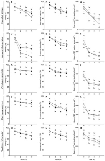 Changes in motility, acrosome integrity, and ATP content in spermatozoa from five hamster species during incubation without or with penicillamine, hypotaurine and epinephrine (PHE). Spermatozoa were collected in medium with (black squares) or without PHE (white squares) and incubated at 37 °C under air for up to 4 h. (A,D,G,J,M) Percentage of motile sperm. (B,E,H,K,N) Percentage of spermatozoa with an intact acrosome. (C,F,I,L,O) Sperm ATP content (amol × cell−1). Values are means ± standard errors. Different letters between times of incubation for the same treatment indicate statistically significant differences (p < 0.05) in a DGC post-hoc test. Asterisks indicate statistical differences (p < 0.05) between treatments for the same time in a DGC post-hoc test.