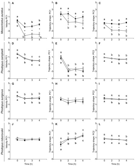 Changes in velocity or trajectory of spermatozoa from five hamster species during incubation in the absence (control) or the presence of penicillamine, hypotaurine and epinephrine (PHE). Spermatozoa were collected in medium with (dark squares) or without PHE (white squares) and incubated at 37 °C under air for up to 4 h. Principal component analysis returned one main velocity component (velocity PC1) and two trajectory components (trajectory shape PC1, trajectory shape PC2). (A,D,G,J) Velocity PC1. (B,E,H,K) Trajectory shape PC1. (C,F,I,L) Trajectory shape PC2. Values are means ± standard errors. Different letters between times of incubation for the same treatment indicate statistically significant differences (p < 0.05) in a DGC post-hoc test. Asterisks indicate statistical differences (p < 0.05) between treatments for the same time in a DGC post-hoc test.