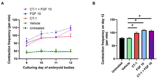 3.1. FGF 10 and CT-1 + FGF 10 Elevate Contraction Rate of Embryoid Bodies