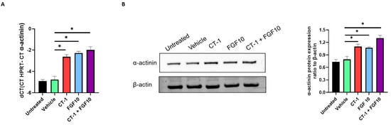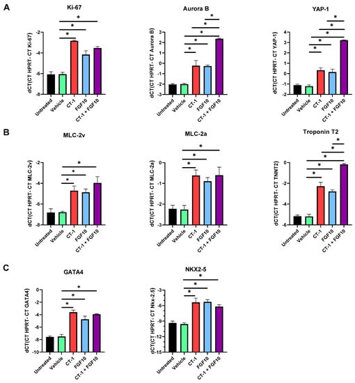 3.3. FGF10 and CT-1 Enhance Cardiomyocyte Structural, Transcriptional and Proliferation Gene Expression