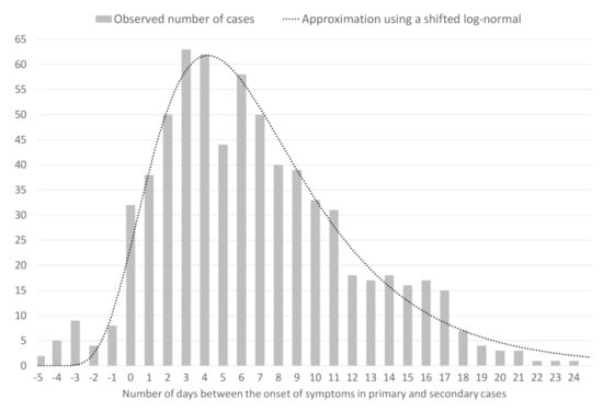 The serial interval obtained by []. The bars represent the observed number of cases in function of the number of days between the onset of symptoms in primary and secondary cases. The dotted line is its approximation by a scaled and shifted log-normal distribution.