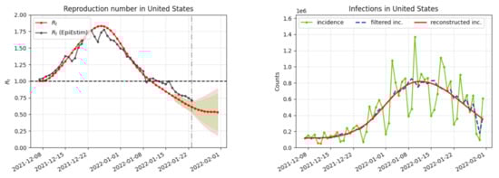 Illustration of the online inversion method []. On the left in red, the obtained reproduction number and in black its estimate obtained by the classic EpiEstim method. On the right in green, the original incidence curve of new cases, in blue the incidence curve corrected of the weekend and festive biases, and in red the final reconstructed incidence curve obtained from by the application of the renewal equation. Estimate obtained for USA on 1 February 2022.