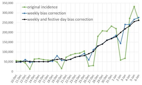 By minimizing this energy we obtain the reproduction number , the seasonality and , which corresponds to the original incidence but with the optimized values in the festive days. The bias corrected incidence defined in model (3) is given by .