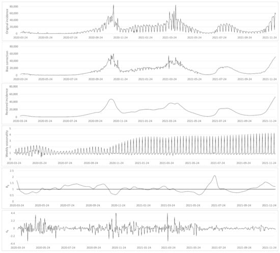We used the incidence data published in [] for France, [] for Germany, [] for Spain and [] for the rest of countries. We checked the observation model and its inversion on the 626 daily incidence data from 24 March 2020 to 9 December 2021 for 38 countries and will detail the results for France, Germany, and the USA. In general, for the festive days we fixed , so the method estimated the incidence value of the festive day and of the next 2 days. However, not all festive days disturb the incidence in the same way. Parameter allows us to adapt the number of days affected. To illustrate this option we set for Thanksgiving in the USA in 2021 because this festive day causes in 2021 a longer perturbation in the number of registered cases. Figure 4, Figure A1 and Figure A2 show the minimization results for the energy (7). They display for each country (i) the original incidence curve , (ii) the incidence curve after bias correction , (iii) the restored incidence curve using the renewal Equation (1), (iv) the weekly bias correction factors , (v) the reproduction number estimation and (vi) the normalized error defined by