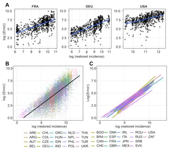 Worldwide log-log correlations between restored incidence and the residual (defined as restored incidence - bias-corrected incidence). The plot presents the log(error) as a function of the log(incidence). The regression parameters were computed through robust linear regression by the R package MASS. (A): Correlation in France, Germany, and USA, with festive day correction. (B): Spread of the values for 38 countries, without festive corrections. (C): Robust linear regression curves for all countries. The linear regression coefficients a and b can be found in Table A2. The worldwide coefficients are and .