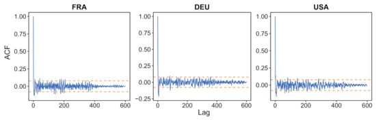 For France, Germany and USA, autocorrelation of the normalized error , using the festive day correction, obtained with the R-software functionalities (acf() function). The orange dotted line provides the 95% confidence interval for non-correlation. Similar plots for the same countries and 33 more countries, without using the festive day correction, are displayed in Figure A5.