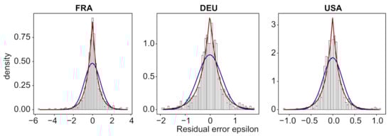 Next, we looked for a stochastic model of the normalized error defined by (9). Figure 4, Figure A1 and Figure A2 visually support a stationarity assumption for in France, Germany and USA.