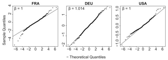 Quantile-quantile plot with France, Germany and the USA comparing , using the festive day correction, with the optimal exponential distribution using the R-package normalp.
