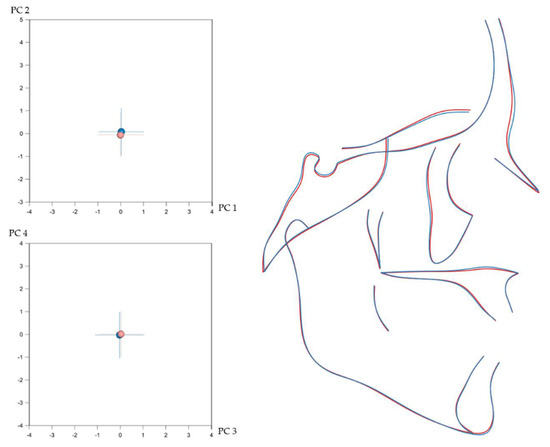 To assess the error of the method, the study methodology was repeated for 30 randomly selected samples, at least two weeks after the first digitization. The shape coordinates of these 30 subjects from the second digitization were compared to the coordinates from the first digitization, in two ways. At first, the mean Procrustes distance between the first and second shape configurations was determined through permutations tests (100,000 permutations) and was minimal, indicating no systematic error (p > 0.5). Moreover, random digitization error was assessed as the percentage of total variance in shape space [30], representing the percentage of variance related to the repetition of the digitization process. Random error was 4.9%, which was considered low and comparable to previous similar investigations [29,34].
