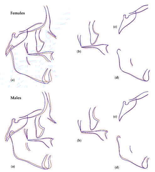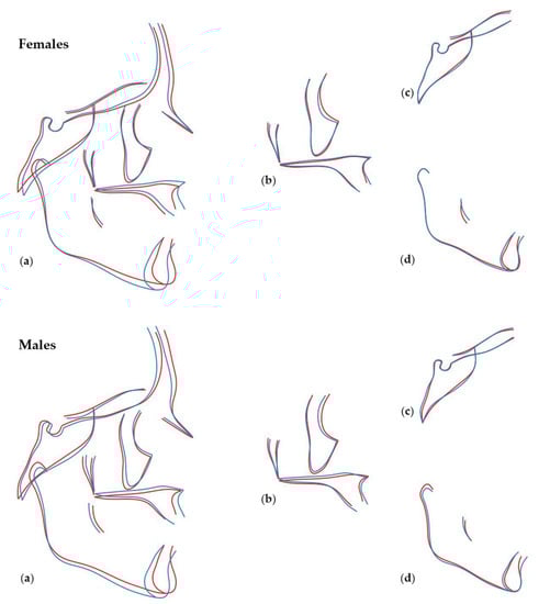 - Katsadouris, A.; Halazonetis, D.J. Geometric morphometric analysis of craniofacial growth between the ages of 12 and 14 in normal humans. Eur. J. Orthod. 2016, 39, 386–394. [Google Scholar] [CrossRef]