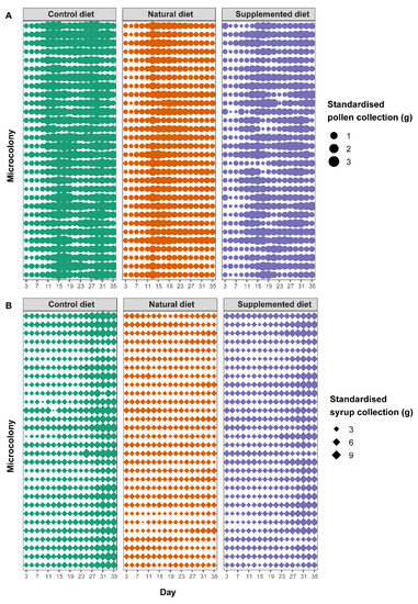 Standardised food collection in microcolonies over time. Each horizontal line represents the collection values for a single microcolony over time. The thickness of the dots or diamonds indicates the mass of collected (A) pollen and (B) syrup, respectively, per g of bee on that day.