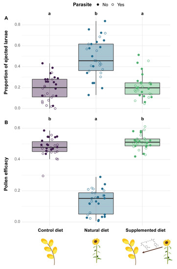 Parasite infection monitoring during our bioassays clearly indicated that both natural and supplemented diets did not reduce the parasite load in infected microcolonies compared to the control diet. This observation is quite surprising and unexpected given the plethora of previous studies that systematically found a medicinal effect of sunflower pollen in infected bumble bees in different experimental designs (i.e., different sunflower cultivars, different parasite strains, workers housed individually or in microcolonies) [27,28,29,30,31,32]. One explanation would be the difference in the host bumble bee species as we used B. (Bombus) terrestris whereas previous studies used B. (Pyrobombus) impatiens, which modifies the host genotype x parasite genotype x environment interacting factor in the Bombus–Crithidia system [22]. Such a discrepancy has recently been demonstrated by Fowler et al. [90] who showed that sunflower pollen reduced Crithidia load in B. impatiens, B. bimaculatus and B. vagans (subgenus Pyrobombus) but not in B. griseocollis (subgenus Cullumanobombus). Another difference in our experimental design is the delay between parasite inoculation and consumption of sunflower pollen, which seems to be a crucial parameter when assessing the medicinal effect of pollen diet. Indeed, previous studies indicated that infected bumble bees fed sunflower pollen 3.5 days after inoculation did not display any reduced parasite load compared to control, whereas infected bumble bees fed sunflower pollen right after inoculation displayed a reduced parasite load after seven days [29] (but see [27]). As our experimental design included an initiation phase after inoculation (i.e., all microcolonies fed for three days on the control diet), there was a delay prior to the consumption of sunflower pollen that could account for the absence of a medicinal effect. Discrepancies may also arise from difference in pollen used as the control diet, namely willow in our study and buckwheat or wildflower mix in previous ones [27,28,29,30,31,32]. Moreover, because of different methods for assessing parasite load (i.e., count in faeces not to kill individuals vs. count in gut suspension), it was not possible to compare infection intensities with those of previous studies. We are then unable to clearly establish which experimental parameter (i.e., bumble bee species, delay between inoculation and sunflower pollen feeding, control diet) was responsible for the absence of a medicinal effect of sunflower pollen (compared to control pollen) in our bioassays, which would partly bring insight for the underlying mechanisms and therefore warrant further investigations.