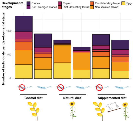 How specific pollen help bees to deal with an infection remains mostly unknown, but studies have suggested that the consumption of particular resources can either impede parasite development (e.g., flagellum removal [23]) or boost bee immunity (e.g., greater fat body content and pro-phenoloxidase production [24]). Notably, the consumption of specific pollen-specialised metabolites has been shown to reduce parasite load in bumble bees [25] and help honeybees to face infection [26]. For instance, sunflower pollen (Helianthus annuus; Asterids: Asteraceae) has been shown to reduce Crithidia bombi (Euglenozoa: Trypanosomatidae) infection in the common eastern bumble bee Bombus impatiens (Hymenoptera: Apidae) [27]. This observation was consistent among several sunflower cultivars and populations [28] but differed according to the timing and duration of exposure to sunflower pollen [29] as well as to the caste of the infected bumble bees [30]. Sunflower pollen has, therefore, been suggested as a suitable resource for infected bumble bees despite its low nutritional quality [31]. Yet, the mechanism underlying such a parasite load reduction remains unknown [32], although it has been recently suggested that it could be due to a more rapid excretion induced by sunflower pollen consumption, and more especially by its phenolamides [33], a major class of phenylpropanoid metabolites evolutionarily conserved across angiosperms [34,35].
