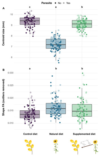 Analyses on FA showed that diet impacted both size and shape FA with males fed natural and supplemented diets during their development displaying a greater FA than those fed a control diet (Size—natural diet: PE = 0.374, CI = 0.055 to 0.694; supplemented diet: PE = 0.990, CI = 0.655 to 1.324; Shape—natural diet: PE = 0.182, CI = 0.098 to 0.266; supplemented diet: PE = 0.272, CI = 0.188 to 0.356). However, only for shape FA did the difference still occur after removing the outliers (natural diet: PE = 0.181, CI = 0.120 to 0.241; supplemented diet: PE = 0.124, CI = 0.063 to 0.185) (Figure 7B). Parasite infection did not influence either size (Outliers included—parasite: PE = −0.001, CI = −0.159 to 0.157; Outliers excluded—parasite: PE = −0.008, CI = −0.125 to 0.109) or shape FA (Outliers included—parasite: PE = 0.001, CI = −0.028 to 0.030; Outliers excluded—factor not retained in the final model, see Table S1).