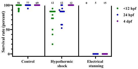 Survival rates for zebrafish following the control treatment, hypothermic shock, or electrical stunning, at 3 different developmental stages (<12 hpf, 24 hpf, and 4 dpf), presented as result per dish. Each dot represents one dish, with the total number of dishes per group indicated at the top of each column (n = 0–77). hpf; hours post fertilization. dpf; days post fertilization.