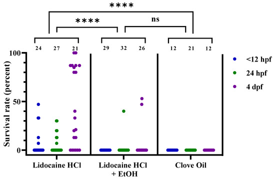 Survival rates for zebrafish following lidocaine hydrochloride (HCl), lidocaine HCl with ethanol (EtOH), or clove oil treatment, at 3 different developmental stages (<12 hpf, 24 hpf, and 4 dpf), presented as result per dish. Each dot represents one dish, with the total number of dishes per group indicated at the top of each column (n = 12–32). Statistical difference between the treatments was assessed by the chi-squared test (p < 0.0001), with post hoc analysis using Fisher’s exact test; ****; p < 0.0001. Note that the statistical analyses were performed on passed/failed dish frequencies (see Table 4 for details) and not on the continuous data presented here. ns; no statistical significance (p = 0.2987). hpf; hours post fertilization. dpf; days post fertilization.