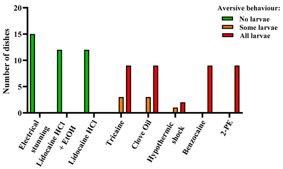 Aversive behavior in zebrafish larvae (4 days post fertilization) during electrical stunning, anesthetic overdose, and hypothermic shock, presented as result per dish. Each experimental dish (n = 3–15 per treatment) contained 10–15 larvae. Dishes were scored as “No larvae”, “Some larvae”, or “All larvae” depending on the proportion of the larvae displaying aversive behavior.