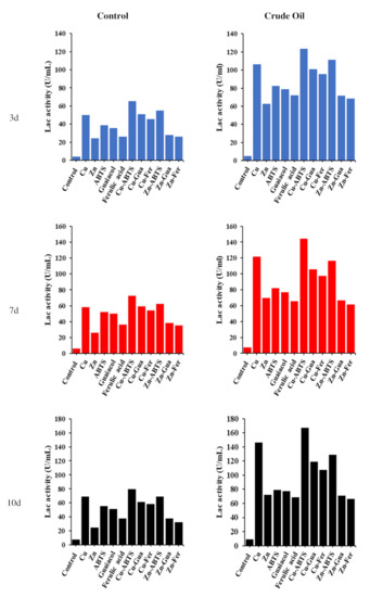 In this study, it was exhibited that fungal isolate A. terreus KC462061 displayed the capacity to produce Lcc with or without crude oil supported by five inducers (Figure 1). Generally, A. terreus KC462061 showed Lcc enzyme activity in a medium without crude oil (control) but in a lower quantity during the 3rd, 7th, and 10th days. While the results of assaying at the same times showed that the enzyme activity of Lcc with crude oil had a higher quantity, which gradually increased during the experiment, the highest enzyme activity induction responses appeared after 10 days of incubation with crude oil. Time-course profiles of Lcc activity in the culture medium containing crude oil were highly indicated due to the five inducers, individual or combined, having a very positive effect on Lcc activity. In the case of the existence of crude oil, the addition of copper ions induces Lcc activity up to 15-fold (98.1 U/mL), whilst the synergistic effect of Cu-ABTS caused an increase in laccase levels up to 22-fold (130.4 U/mL) in comparison to the reference condition at 10th day (Figure 1).
