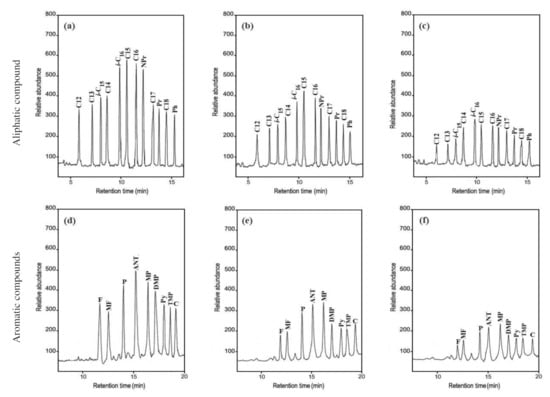 Gas chromatography–mass spectrometry (GC-MS) analysis of crude oil samples before and after biodegradation. (a) The aliphatic hydrocarbons of crude oil control; (b) biodegradation sample of A. terreus KC46206; (c) biodegradation sample of A. terreus KC46206 and Cu-ABTS. (d) The aromatic hydrocarbons of crude oil control; (e) biodegradation sample of A. terreus KC46206, (f) biodegradation sample of A. terreus KC46206 and Cu-ABTS, all treatments after 10 days.