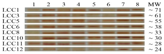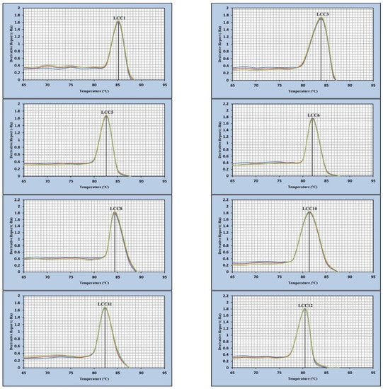 Through the establishment of melting-curve-based monoplex real-time PCR, equivalent melting temperatures (Tm) of each primer pair was confirmed by detecting each gene in the RT-PCR analysis (Figure 4). The optimum selected primers useful to amplify the corresponding Lcc genes generating a dissociation curve with a specific peak and the Tm values of all amplicons were as follows: 85.17 °C for Lcc1, 83.97 °C for Lcc3, 82.64 °C for Lcc5, 84.41 °C for Lcc8, 81.45 °C for Lcc10, 82.31 °C for Lcc11 and 80.51 °C for Lcc12.