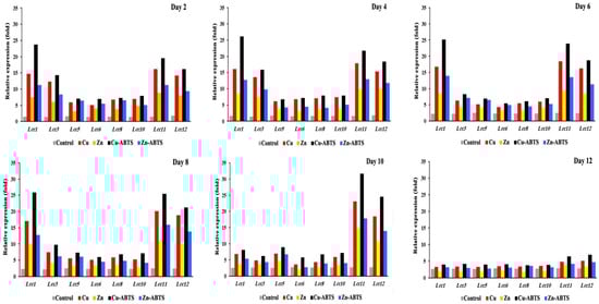 The transcriptional patterns of the eight laccase genes, Lcc1, Lcc3, Lcc5, Lcc6, Lcc8, Lcc10, Lcc11, and Lcc12, were assessed on the second, 4th, 6th, 8th, 10th, and 12th days of fungal development, supported by Cu, Zn ions, Cu-ABTS, Zn-ABTS, and 1% crude oil, and the findings are given in Figure 5. All Lcc genes were demonstrated to be stimulated in the assayed conditions, with induction levels varying from two- to fifteen-fold higher than in the reference conditions.