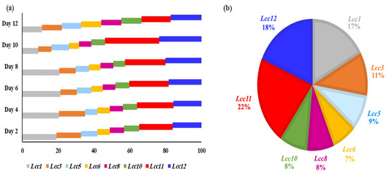 Lac1, 3, 8, and 11 had the most significant changes in transcription levels (>10-fold). The other genes, Lcc5, 6, 8, and 10, have low levels of significance on days 2 and 4. The genes have new levels of significance on days 6 and 8, where transcription levels of Lcc1 (11.1- and 11.5-fold, respectively), Lcc11 (9.6- and 10.2-fold, respectively) and Lcc12 (7.8- and 8.9-fold, respectively) based on induction by Cu-ABTS, comparing the corresponding expression levels on day 6 and 8. On day 10, the transcriptional profiles of Lcc11 and 12 were the most highly significant during this stage. On day 12, the process of translation was very slightly down-regulated for all Lcc genes. Therefore, the gene expression levels were changed in all Lcc genes by up to two-fold or less, and four inducers failed to produce a powerful induction for all Lcc genes, so transcription has almost stopped at this stage. In general, Cu-ABTS have highest induction level of transcription process. Among the eight Lcc genes, Lcc1, 11 and 12 were predominantly expressed from 2 to 8 days, but on the 10th day, only Lcc 11 and 12 were predominantly expressed (Figure 6a). Lcc1, 11, and 12 were the most abundantly expressed at 17%, 22%, and 18%, during transcription for 12 days (Figure 6a), but other Lcc genes transcription was negligible relative to abundant genes (Figure 6b).