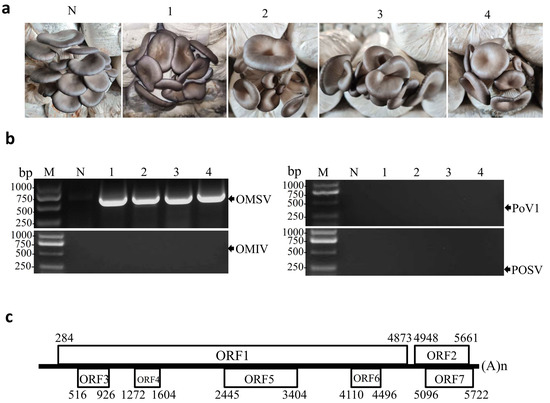 RT-PCR detection of OMSV in malformed fruiting bodies of P. ostreatus. (a) The collected fruiting body samples from P. ostreatus cultivar 8129 display symptoms of funnel-shaped or morning glory–shaped caps. (b) RT-PCR detection for the presence or absence of OMSV, OMIV, POSV, or PoV1 from fruiting body samples described in (a). Lanes 1–4, four fruiting body samples of P. ostreatus that were positive for OMSV by RT-PCR. N, negative control, the healthy P. ostreatus sample; M, GL DNA Marker2000. (c) Schematic representation of the OMSV-Ch genome structure. Boxes represent the ORFs. Numbers represent nucleotide positions.