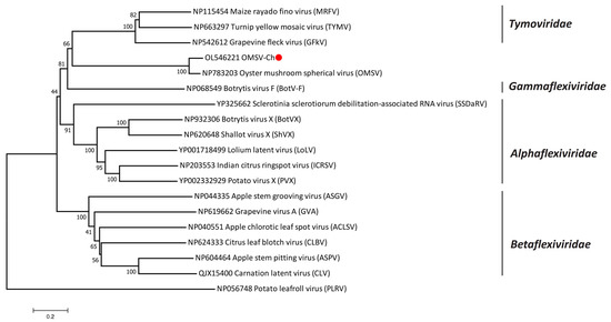 According to the International Committee on Taxonomy of Viruses (ICTV), OMSV is considered an unclassified virus, though it has been previously reported to have the closest relationship with tymoviruses [26]. In order to better understand the taxonomic status of OMSV, phylogenetic trees were generated and visualized with MEGA (Version 7.0). A phylogenetic tree based on the RP amino acid sequences of the members in the order Tymovirales showed that the OMSV-Ch strain clustered with OMSV-Kr and that they were both more closely related to the Tymoviridae than to any other family (Alphaflexiviridae, Betaflexiviridae, or Gammaflexiviridae) of the Tymovirales order (Figure 2). Further phylogenetic analysis based on the RP and CP showed that the OMSV was distinct from tymoviruses, marafiviruses, and maculaviruses (Figure 3a,b), suggesting that the OMSV may belong to a new genus of the Tymoviridae family.