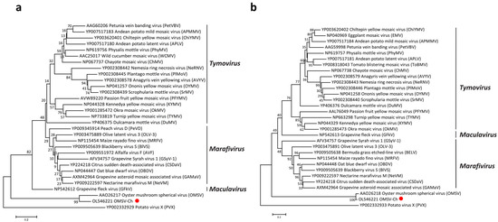 Phylogenetic analysis of the OMSV-Ch replication protein (a) and coat protein (b) with corresponding proteins of tymoviruses, marafiviruses, and maculaviruses. The OMSV-Ch sequence from the present study is marked with a red dot. Potato virus X (PVX) was used as an outgroup.