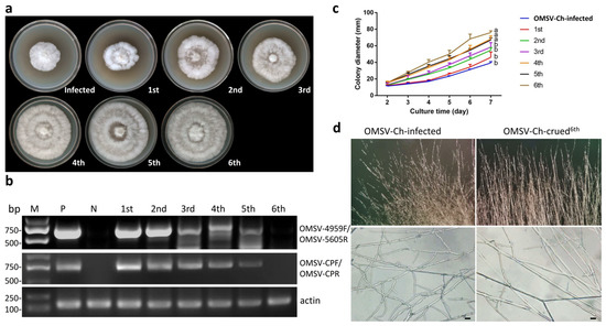 We determined that the mycelia of the P. ostreatus 8129 strain were infected with OMSV via RT-PCR. In order to better understand the effect of OMSV-Ch infection on the vegetative characteristics of P. ostreatus, we aimed to cure the P. ostreatus 8129 from the OMSV-Ch in order to obtain an OMSV-Ch-cured isogenic strain. The single hyphal tip culture method combined with heat treatment, as described in the “Materials and Methods” section, was used for OMSV-Ch curing. The mycelia were transferred to potato dextrose agar (PDA) containing 50 μg/mL ampicillin and incubated at 32 °C, and this process was repeated 6 times. In order to examine the effects of the OMSV-Ch infection on the colony growth, the isogenic OMSV-Ch-cured and OMSV-Ch-infected P. ostreatus strains were cultured on PDA plates. After 7 days of culture, we observed the mycelial growth displayed an accelerated growth rate along with the increasing number of transfer treatments (Figure 4a). The presence or absence of the OMSV-Ch in the P. ostreatus mycelia was determined by RT-PCR detection with two pairs of primers. The sixth generation of the mycelia became free of OMSV-Ch (Figure 4b).