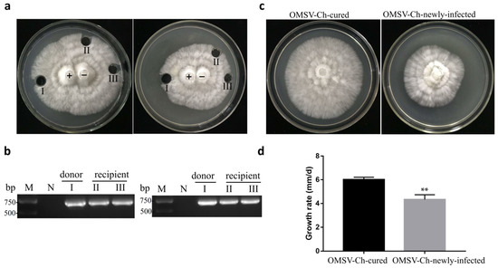 Pairwise co-cultivation of OMSV-Ch-infected (+) and OMSV-Ch-cured (−) strains of P. ostreatus. (a) After incubation for 5 days at 25 °C, one inoculum from the donor side (I) and two inocula from the recipient (II and III) were sub-cultivated for 5 days. (b) RT-PCR detection for the presence of OMSV. Negative controls of pairing tests were OMSV-Ch-cured strains. M, GL DNA Marker2000. (c) Colony morphology of the OMSV-Ch-cured strain compared to the newly infected OMSV-Ch strain after 5 days of incubation at 25 °C. (d) Growth rate of OMSV-Ch-cured and newly infected OMSV-Ch strains of P. ostreatus. ** p < 0.01 highlight significant growth differences by independent sample t-test.