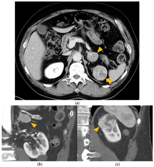 Position of metastatic and primary cancers. (a) Primary tumor in the left kidney (arrow) and metastatic tumor in the left adrenal gland (arrowhead). (b) Metastatic tumor in the left adrenal gland (arrowhead). (c) Renal cell carcinoma in the upper pole of the left kidney (arrowhead).