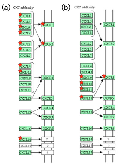 Association of CXC subfamily pathways in renal cell carcinoma (adrenal cancer cells). (a) Adrenal cancer cells. (b) Renal cell carcinoma. Red star: Expression-variable genes on the pathway.