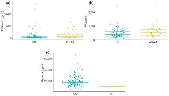 Coagulation proteins were determined in the plasma of 131 patients with severe COVID-19, and the association with F5 rs6025 and SERPINE1 rs6092 was assessed. For the SERPINE1 rs6092 variant, P-Selectin and tPA levels were significantly different among GG carriers vs. AG+AA genotypes. In addition, lower levels of Factor IX were observed for the patients with the CT genotype of F5 rs6025 compared to CC carriers (Figure 1, Table 4); however, further studies are required to confirm this finding since the CT group only included the two patients carrying the alternative allele of the F5 rs6025. The levels of the remaining proteins were not different among the studied genotypes (Table 4, Supplementary Figures S2 and S3).