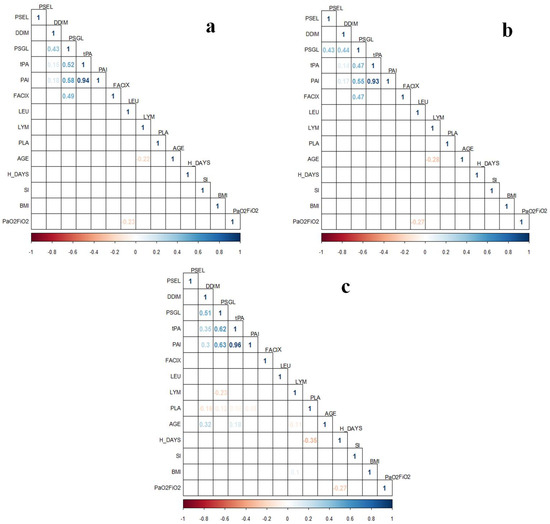 Correlation plots of coagulation proteins’ levels from one-time determination subgroup (n = 131) with clinical variables in patients with COVID-19. (a) Analysis including all samples of the one-time determination subgroup (n = 131); (b) Analysis only including patients carrying the SERPINE1 rs6092 GG genotype (n = 92); (c) Analysis only including patients carrying the SERPINE1 rs6092 AG+AA genotypes (n = 39). Correlations were assessed with Spearman Correlation Test. Only statistically significant ρ values (p < 0.05) are shown in the plots. BMI, body mass index; FACIX, Factor IX; DDIM, D-dimer; H_DAYS, hospitalization days; LEU, leukocytes; LYM, lymphocytes; PAI, plasminogen activator inhibitor-1; PLA, platelets; PSGL, P-selectin glycoprotein ligand-1; PSEL, P-selectin; SI, smoking index; tPA, tissue plasminogen activator.