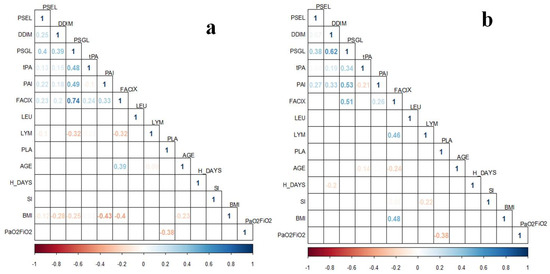 Correlation plots of coagulation proteins’ levels from the two-time determination subgroup (n = 35) with clinical variables in patients with COVID-19. (a) Coagulation proteins correspond to the delta values assessed (Time 1–Time 2); (b) Coagulation proteins’ levels from the second determination (Time 2). Correlations were assessed with Spearman Correlation Test. Only ρ values statistically significant (p < 0.05) are shown in the plots. BMI, body mass index; FACIX, Factor IX; DDIM, D-dimer; H_DAYS, hospitalization days; LEU, leukocytes; LYM, lymphocytes; PAI, plasminogen activator inhibitor-1; PLA, platelets; PSGL, P-selectin glycoprotein ligand-1; PSEL, P-selectin; SI, smoking index; tPA, tissue plasminogen activator.