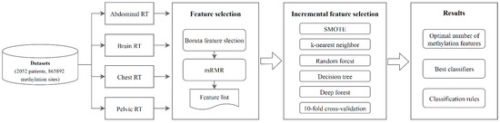 Computational workflow of this study. The methylation dataset was acquired in four sections from a public database: abdominal RT, brain RT, chest RT, and pelvic RT. The methylation features in each methylation profile were filtered and ranked using the Boruta feature selection and mRMR methods. The IFS method used the resulting feature list to identify the optimal number of features and develop the best classifiers and classification rules by combining SMOTE and classification algorithms.