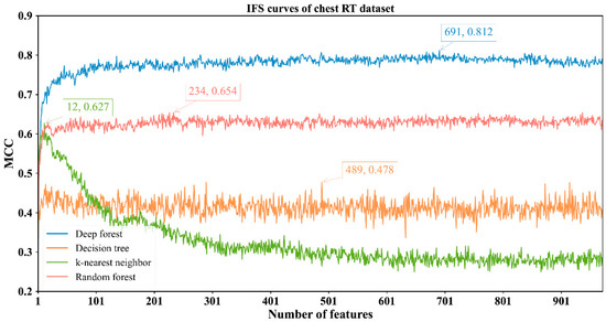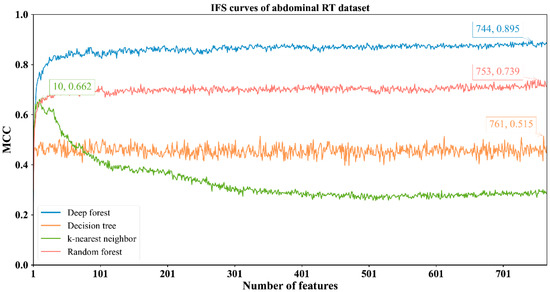 The feature lists sorted by the mRMR method were fed into the IFS method with four classification algorithms to determine the best number of features. When the step size was set to 1, the first feature subset produced by IFS was the first feature in the list, the second feature subset was made up of the top two features, and so on. For example, the abdominal RT dataset yielded 766 feature subsets. Subsequently, four classification algorithms, namely, DF, kNN, RF, and DT, were adopted to build classifiers by using the sample data represented by these feature subsets and evaluation metrics were obtained. The performance of these classifiers with different feature subsets in different methylation datasets is provided in Tables S2–S5. The IFS curves were plotted with MCC as the vertical coordinate and the number of features as the horizontal coordinate, as shown in Figure 2, Figure 3, Figure 4 and Figure 5.