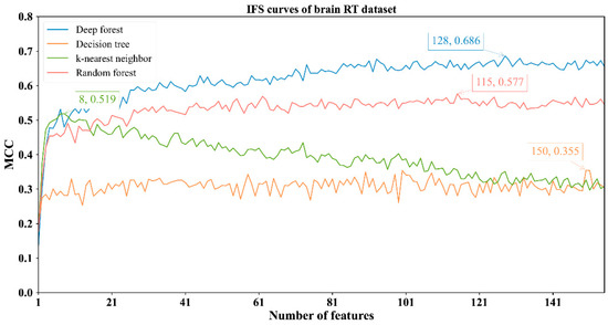 For the other three datasets, DF still provided the highest MCC. In detail, DF with the top 128 features yielded the MCC of 0.686 on the brain RT dataset (Figure 3); DF with the top 691 features produced the MCC of 0.812 on the chest RT dataset (Figure 4); DF with the top 155 features generated the MCC of 0.914 on the Pelvic RT dataset (Figure 5). The ACC values of these DF classifiers were 0.869, 0.925, and 0.976 (Table 2), respectively. These values were all higher than those of the other three classification algorithms (Table 2). MCC was at least 10% higher and ACC was 5% higher, suggesting DF can capture more essential information in these datasets, thereby building more efficient classifiers.