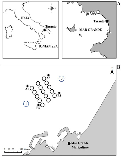 The study was carried out in a fishing farm, “Maricoltura del Mar Grande”, located in the Mar Grande of Taranto (40°25′56″ N; 17°14′19″ E) (Ionian Sea) (Figure 1A), at approximately 600 m from the coast. It has a surface area of 0.06 km2 and consists of 15 fish cages (Ø 22 m), arranged in three rows each with five cages, working at a depth ranging from 7 to 12 m. Two fish species, i.e., the European seabass Dicentrarchus labrax (Linnaeus, 1758) and the sea bream Sparus aurata (Linnaeus, 1758), are farmed here, with a yield of approximately 100 tons/year. This mariculture plant participates in the REMEDIA-LIFE project, making six cages available for the innovative IMTA system. In the same zone, the intensive farming of Mytilus galloprovincialis (Lamarck, 1819) is also carried out.