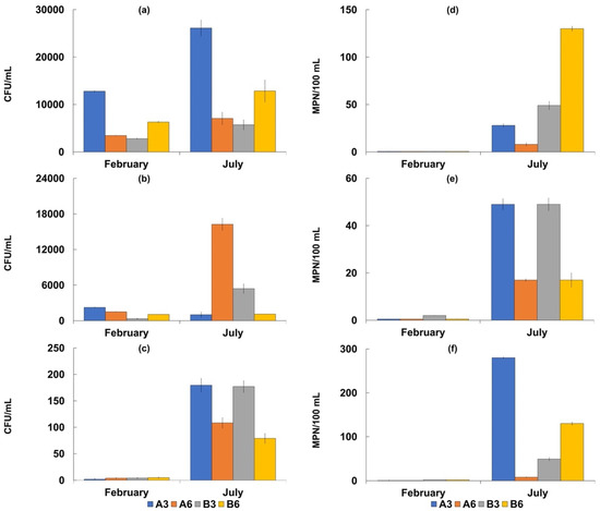 Concentrations of the considered microbiological parameters in seawater samples collected in February and July 2018 at the four sampling sites (A3, A6, B3 and B6). Bacterial counts are reported as mean values ± S.D. of three replicates. Bacterial counts are expressed as CFU/mL for culturable heterotrophic bacteria at 22 °C (a), culturable bacteria at 37 °C (b) and culturable vibrios (c), and as MPN/100 mL for fecal coliforms (d), fecal enterococci (e), and total coliforms (f).