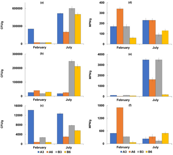 Concentrations of the considered microbiological parameters in sediment samples collected in February and July 2018 at the four sampling sites (A3, A6, B3, and B6). Bacterial counts are reported as mean values ± S.D. of three replicates. Bacterial counts are expressed as CFU/g for culturable heterotrophic bacteria at 22 °C (a), culturable bacteria at 37 °C (b) and culturable vibrios (c), and as MPN/g for fecal coliforms (d), fecal enterococci (e) and total coliforms (f).