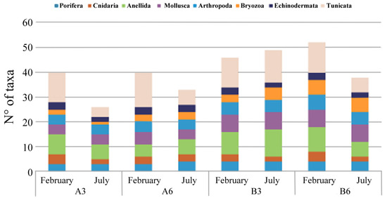 In all the areas, the assemblages appeared less diverse in July; moreover, both A stations, especially in this warm period, showed the lowest number of taxa (Figure 4).