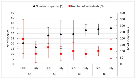 Soft bottom communities revealed the presence of 163 taxa, with polychaeta being the most abundant (106 taxa) followed by Crustacea (31 taxa). As regards the species richness (S) and the number of individuals (N), Figure 5 shows a gradient from Station A3 to B6: the first shows poor biodiversity and a high abundance of organisms, while going toward B6, we can see the opposite situation.