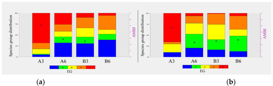 The observed AMBI and M-AMBI values were derived using AMBI software (version 6.0), which can be downloaded from the freeware http://ambi.azti.es (accessed on 19 September 2018). The AMBI method considers five ecological groups (EG), such as EG I, which includes the most disturbance-sensitive species, while EG V includes the first-order opportunistic species [12].