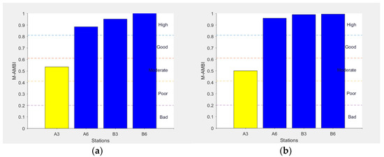 M-AMBI values and respective ecological status relative to the 4 examined sites in February (a) and July (b) (modified from [28] with permission from IEEE, 2022, Copyright Clearance Center’s RightsLink®).